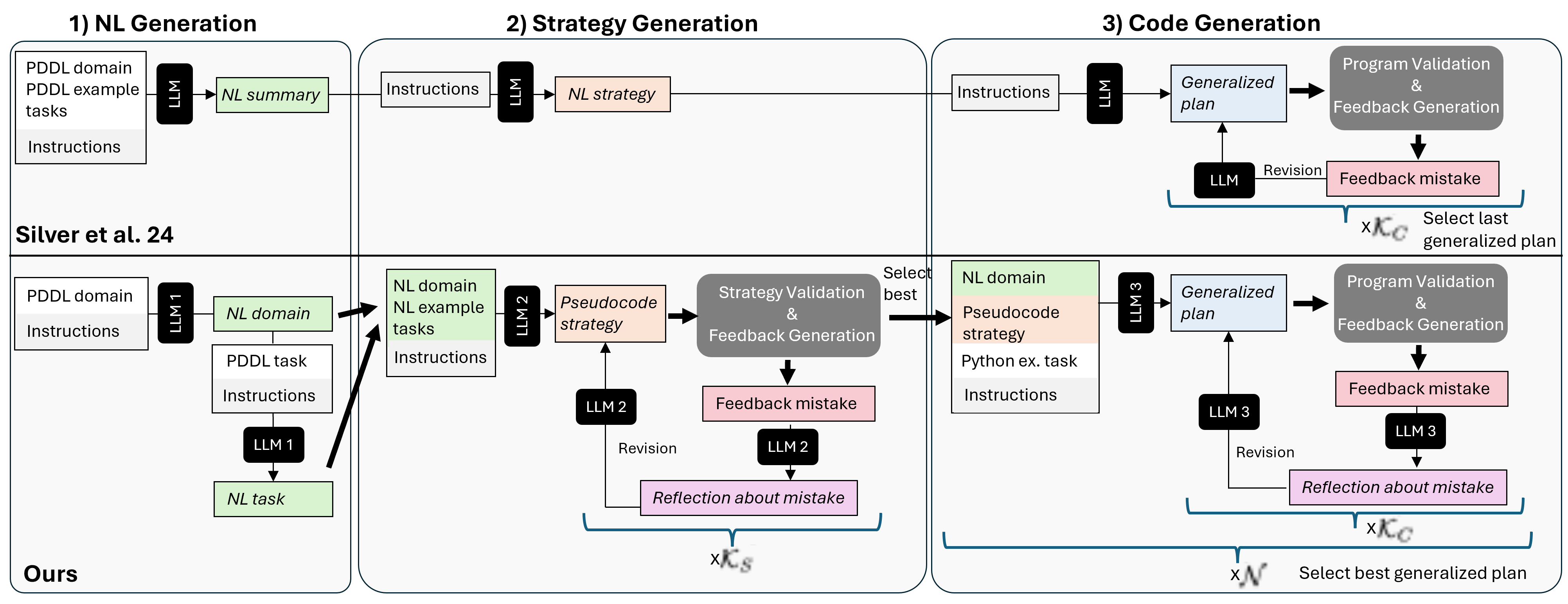 In their work, only one strategy is generated and passed directly to the program generation. If the strategy is incorrect, its implementation will therefore result in an incorrect generalized plan.