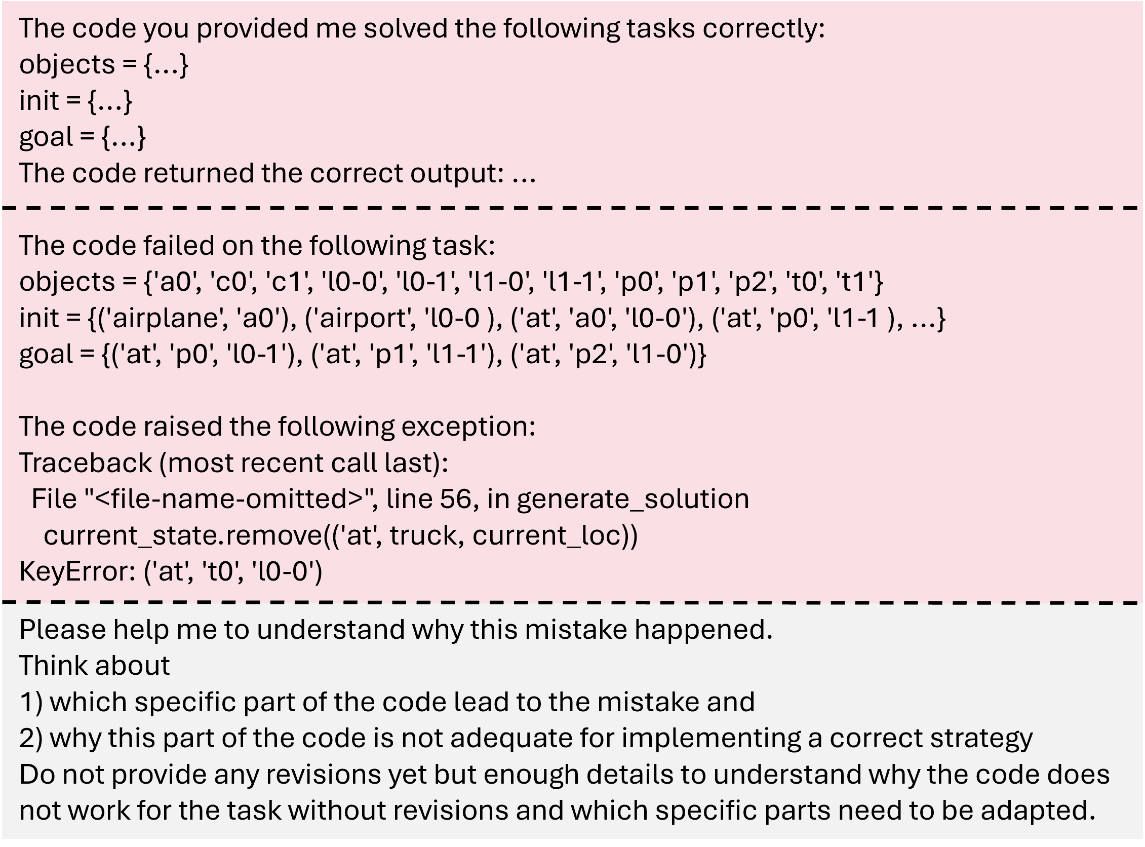 The feedback is combined with the generated plan and instructions to reflect about the part of the pseudocode that caused the mistake and the reason why that part is incorrect (inspired by e.g. Madaan et al. 2023; Shinn et al. 2023).