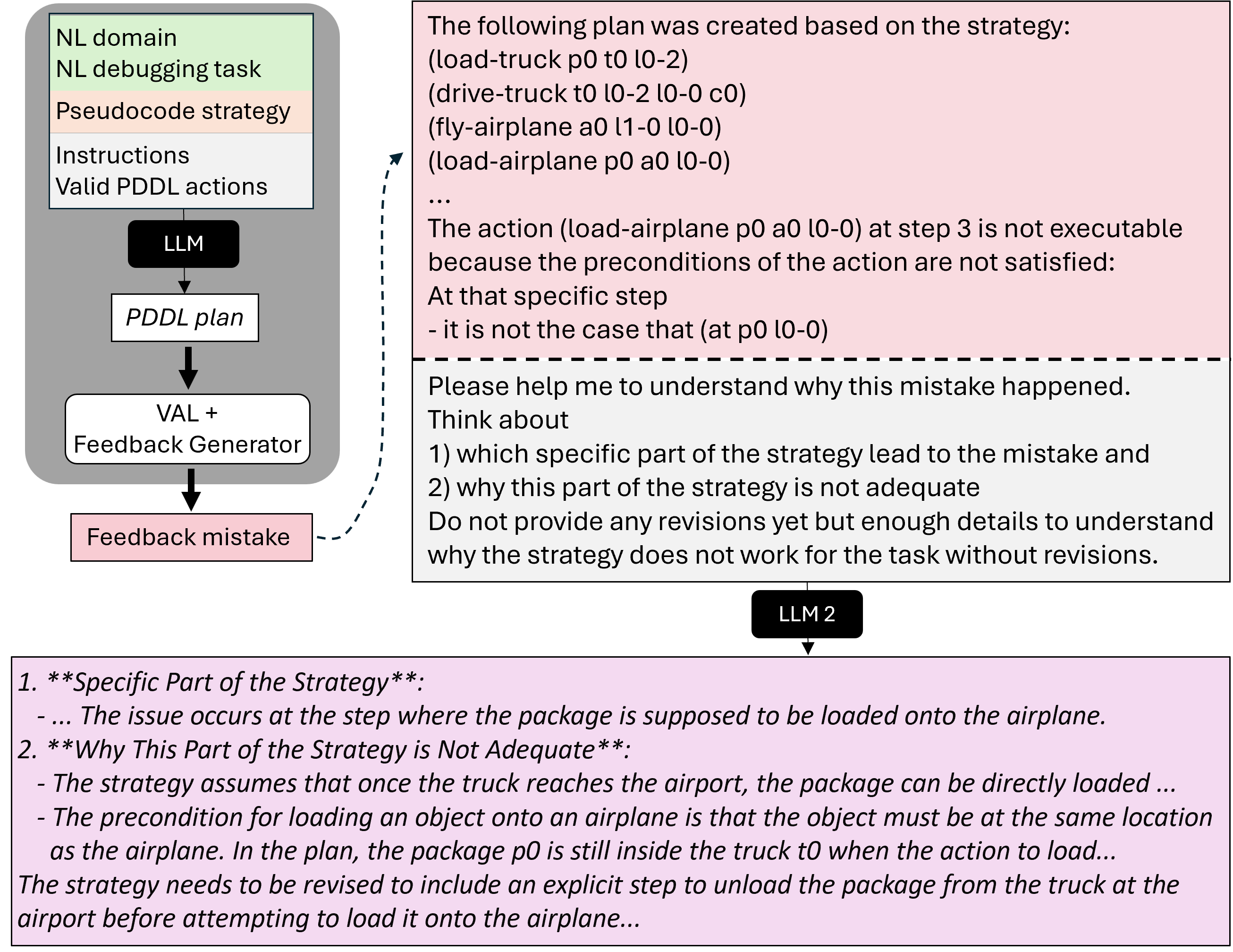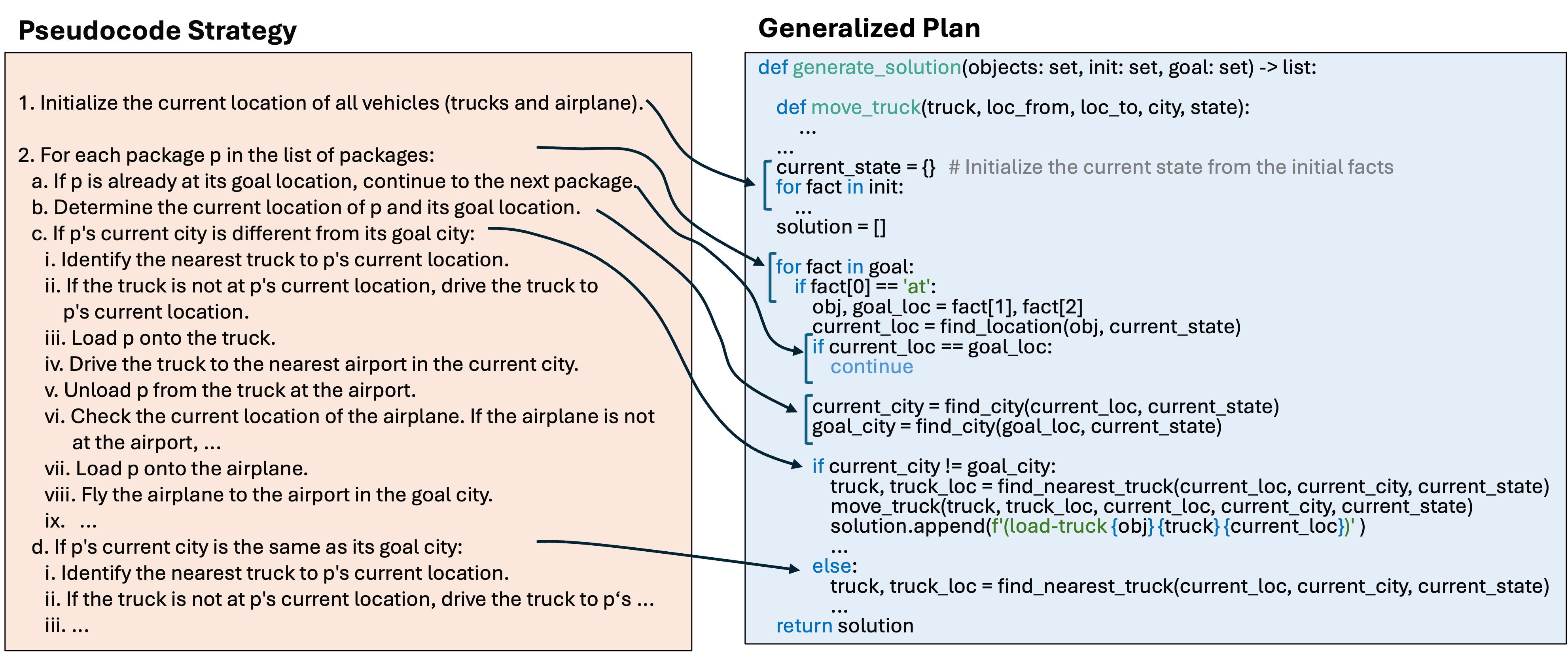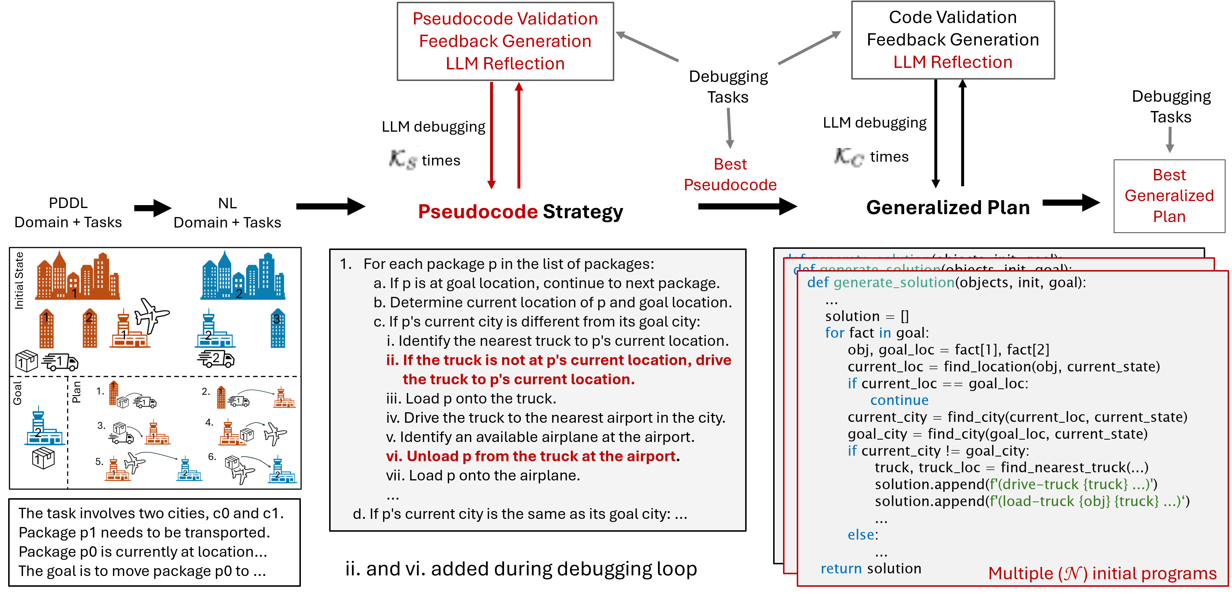 the LLM then implements that strategy as a Python program, that gets debugged on example planning tasks.