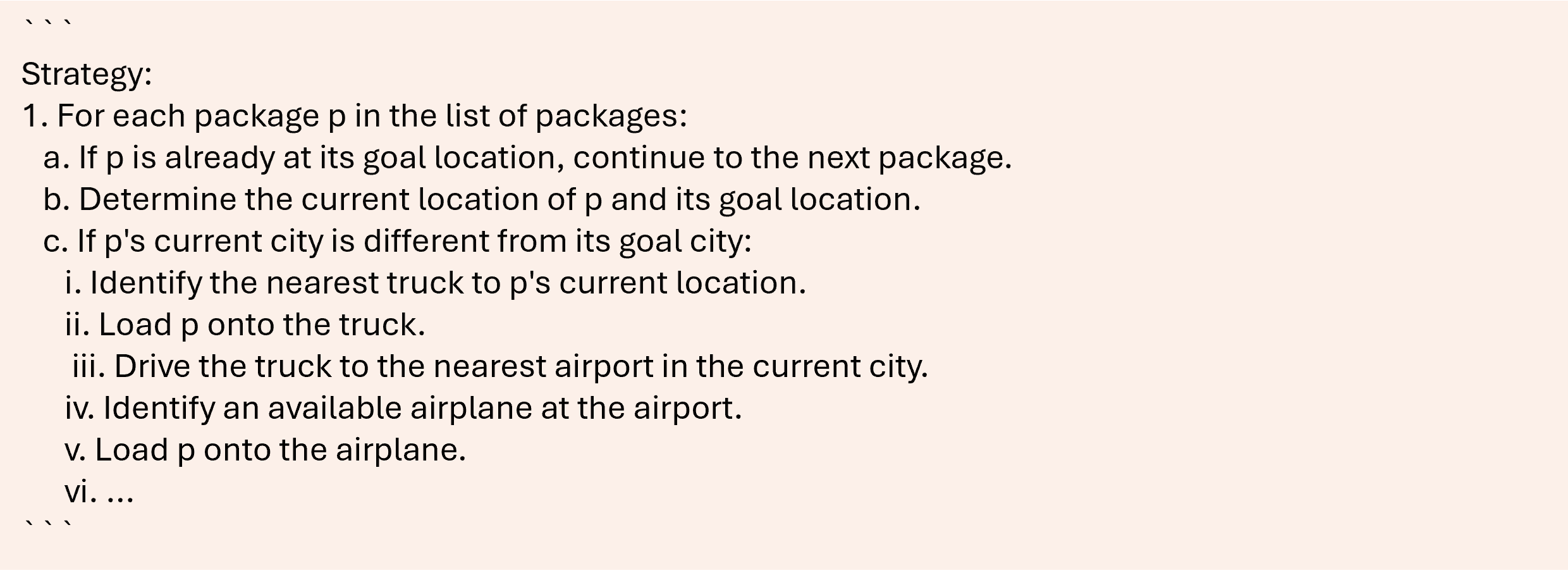 We instruct the LLM to generate the strategy in the form of pseudocode that should be detailed and specific enough to be converted into an executable program in a straightforward way. The prompt for this step consists of the NL descriptions of the domain and two example tasks and instructions to think step-by-step (zero-shot CoT, Kojima et al., 2022).