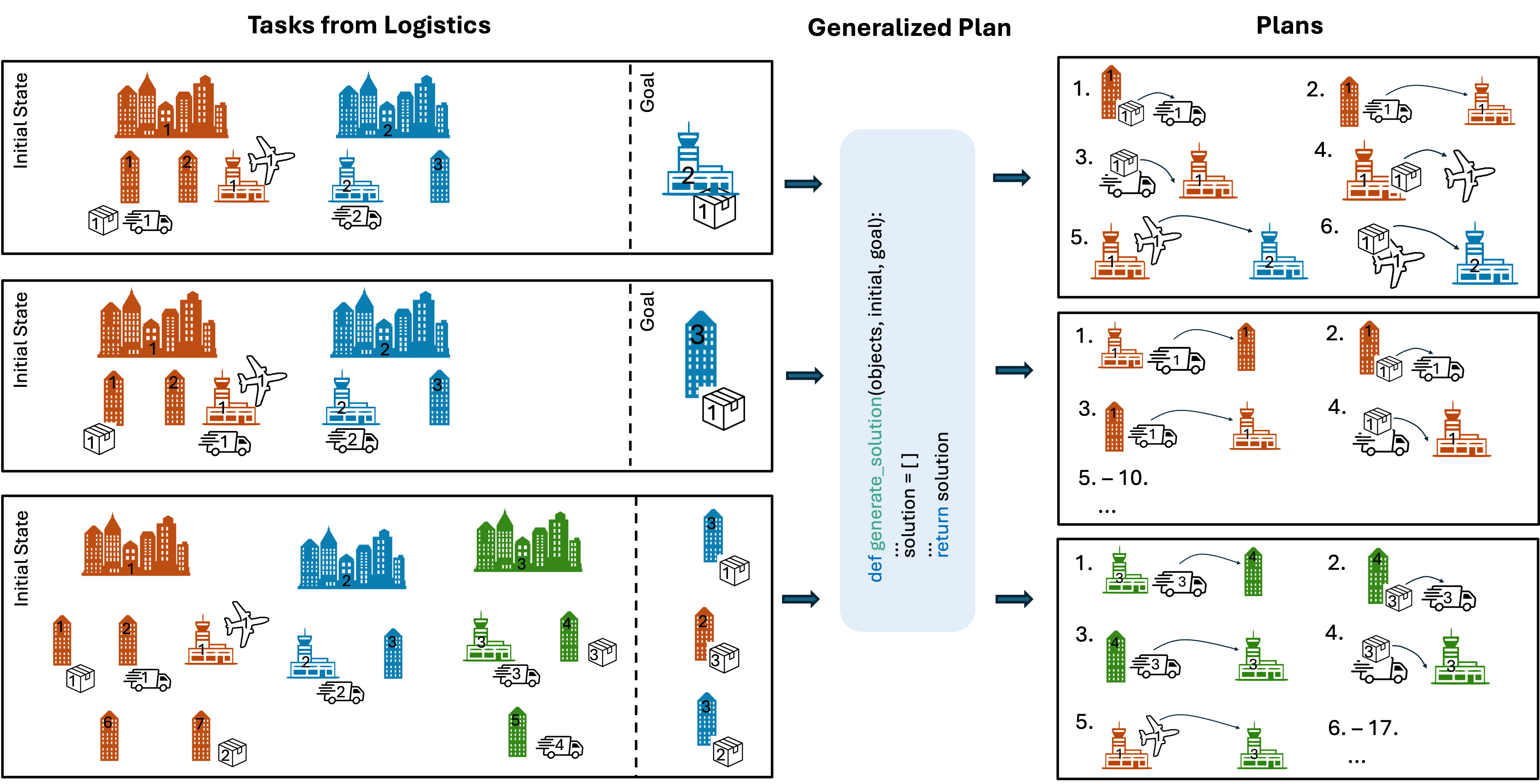 Our approach generates Python programs that can take any of such tasks from the Logistics domain as input and generates the corresponding plan, i.e. the sequence of actions required to transfomr the specific initial state into a state satisfying the goal constraints.