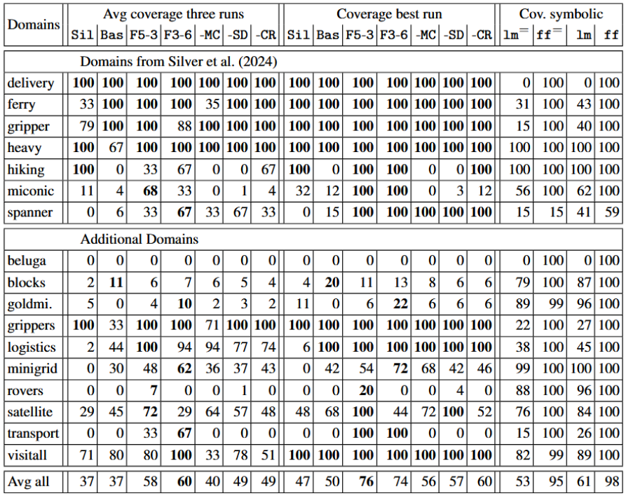 Table 1: Percentage of solved tasks for the original framework by Silver et al. (2024) (Sil) and the re-implemented baseline (Bas) and our generalized planning approach with N = 3, KC = 6 (F3-6) and N = 5, KC = 3 (F5-3). The three ablations -MC, -SD and -CR are based on F3-6. We report the average coverage over three runs and coverage of the best run. For both, we show in bold the best generalized planning approach. The symbolic baselines were run for the same time limit as the generalized plans (45 seconds) (lm= and ff=) and for 30 minutes (lm and ff).