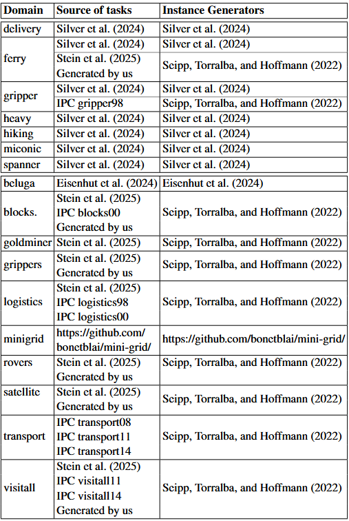 For our experiments, we focus on domains that have previously been used in research on LLMs in the context of classical planning. In particular, we use the domains from Silver et al. (2024)’s generalized planning experiments and Stein et al. (2025)’s LLM action-choice experiments. Table 2 shows for each of the domains the sources of the tasks we include in our experiments. All tasks included in our experiments are solvable. The right column of Table 2 shows the origin of the instance generators that we used to generate additional tasks for some of the domains, and that we used for the manual evaluation of the generalization power of our generalized plans.